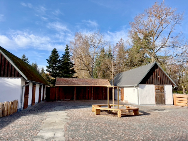 Mittlerweile sind die Außengehege fertiggestellt, der Bauerngarten ist bepflanzt und der eigentliche Hof mit historischer Pflasterung, der „Dorflinde“ (in unserem Fall ein Kirschbaum), Stallungen und der neugebauten Remise geht seiner Vollendung entgegen. In den nächsten Monaten werden die letzten Arbeiten – der Umbau der Scheune und der Neubau des Holzlagers folgen.